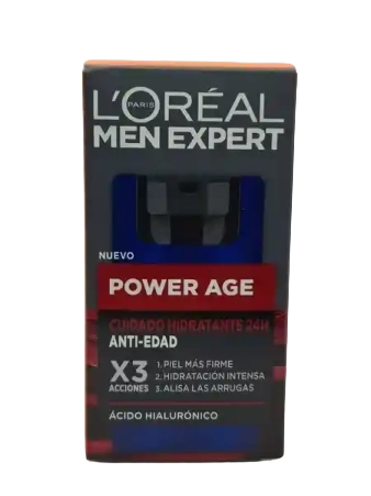 Una nueva era de cuidado antiarrugas para hombres. Dale a tu piel la fuerza de envejecimiento en excelente forma. Aquí está la crema hidratante revitalizante de 24 horas * Power Age de L’Oréal Paris Men Expert diseñada para hombres que luchan con la piel seca y sin vitalidad con signos visibles de envejecimiento. Fórmula enriquecida con ácido hialurónico, conocida por sus propiedades hidratantes, proporciona un triple efecto: – Reafirma y fortalece la elasticidad de la piel. – Hidrata intensamente para una sensación de piel fresca y revitalizada. Mejora la suavidad de la piel. La crema se absorbe rápidamente sin dejar una capa grasa o pegajosa en la piel, lo que garantiza una gran comodidad de uso. Probado bajo control dermatológico.