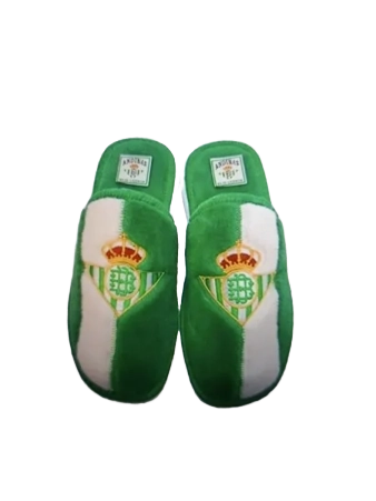 Zapatilla de andar por casa de fútbol Oficial del Real Betis Balompié. El escudo del equipo está bordado en la pala. Suela de Eva. Fabricada en España.